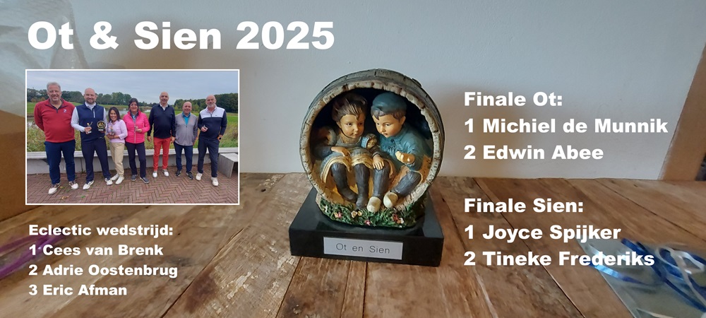 Vanaf juni werden de voorrondes voor de Ot & Sien wedstrijd (matchplay met 75% handicapverrekening) gespeeld, met het ultieme doel de finales te bereiken. Bij de dames ging het in de finale tussen Joyce en Tineke, bij de heren ging de strijd tussen Michiel en Edwin. Beide partijen waren spannend: Joyce won met 3&1, terwijl Michiel op hole 18 de pot binnenhaalde, onder her toeziend oog van de deelnemers aan de Eclectic wedstrijd. Deze wedstrijd is speciaal opgezet om ervoor te zorgen dat er publiek is bij de prijsuitreiking voor de finalisten. Anders sta je als nieuwe Ot of Sien alleen maar voor jezelf een Ot of Sien beeldje in ontvangst te nemen en te speechen. Names al die deelnemers en wedstrijdleiders Rolf en Eric, van harte gefeliciteerd!