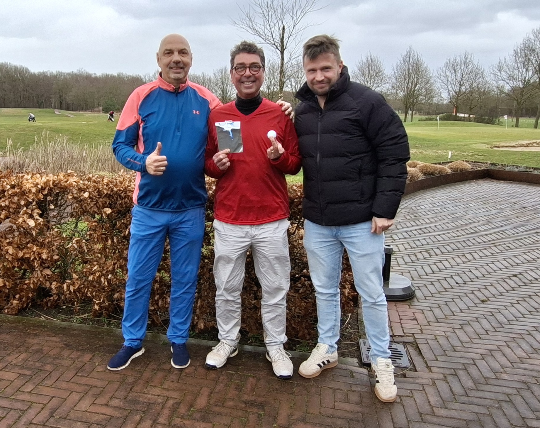 De Vossenjacht is de eerste wedstrijd van het jaar over 18 holes. Het leuke aan deze wedstrijd is dat je direct na het uitholen op iedere green nog niet weet hoe je hebt gescoord, want dat doe je ten opzichte van de vos. En de score van de vos zie je op de volgende tee. Je kunt dus wel een 8 hebben gemaakt en dan blijkt de vos een 9 te hebben gescoord. Of je juicht vanwege een birdie, maar dan blijkt dat de vos er ook eentje heeft gescoord. Levert je dan slechts een 0 op. En je wilt vooral meer plusjes dan minnetjes. Het is ook een wedstrijd waarbij je als wedstrijdleiders even goed moet opletten, de vos moet namelijk alszodanig in het systeem worden aangemerkt, en dan is de vraag bij het invoeren van de scores: de vos voert de netto scores in, maar wat moet de rest doen? Nu wilden we daar de spelers daar niet te veel mee lastig vallen, het kost vaak al moeite om iedereen tot aan de prijsuitreiking binnen te houden. Dus we hebben gewoon het aantal plusjes en minnetjes op de kaarten aangehouden. En dat bracht ons tot de onderstaande top drie: